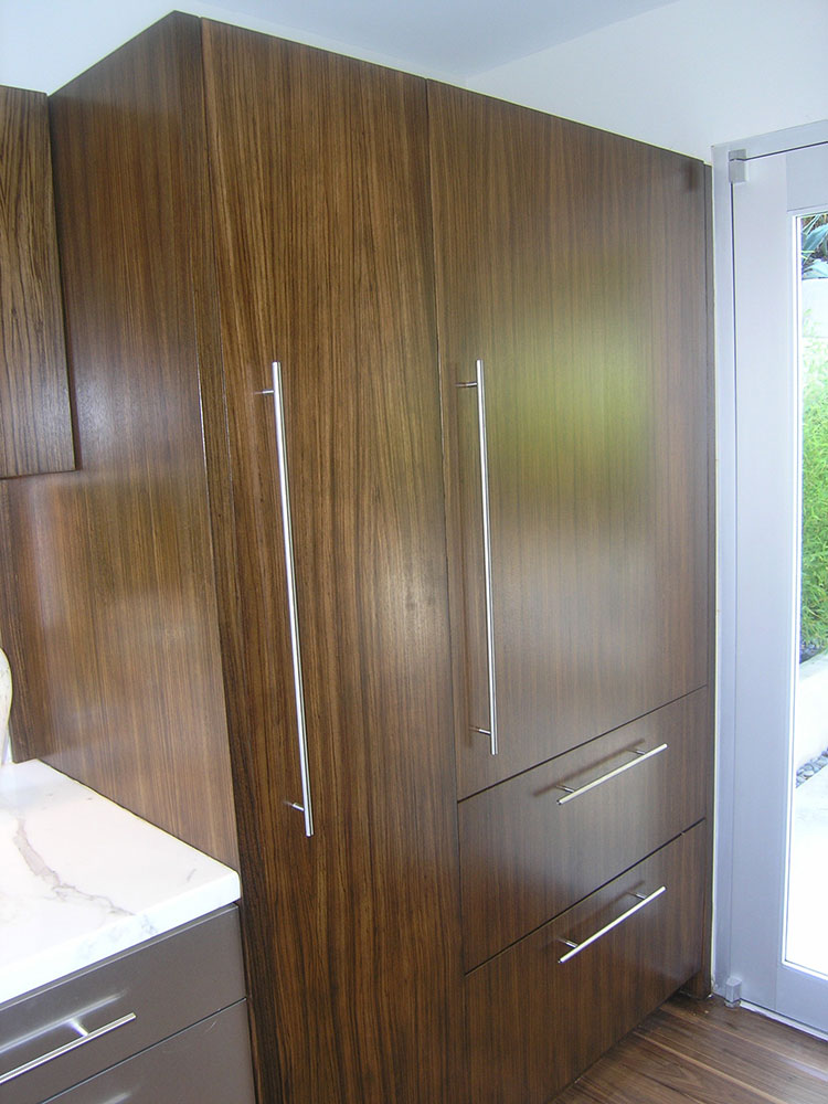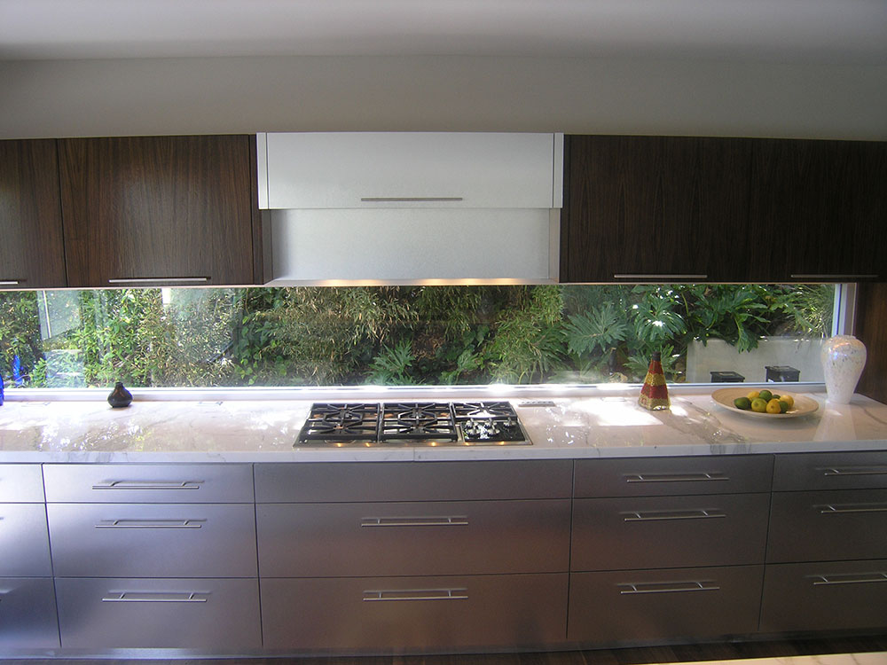 This unique, contemporary galley kitchen finds its inspiration in picturesque Los Angeles. Stunning lines are balanced with functional storage space, and the excitement of Los Angeles is visible through the beautiful walls of windows. Extraordinary details are found throughout, with key features like: