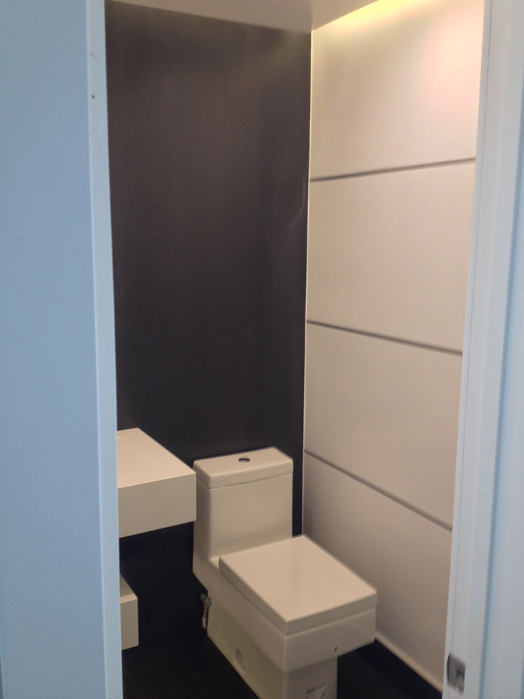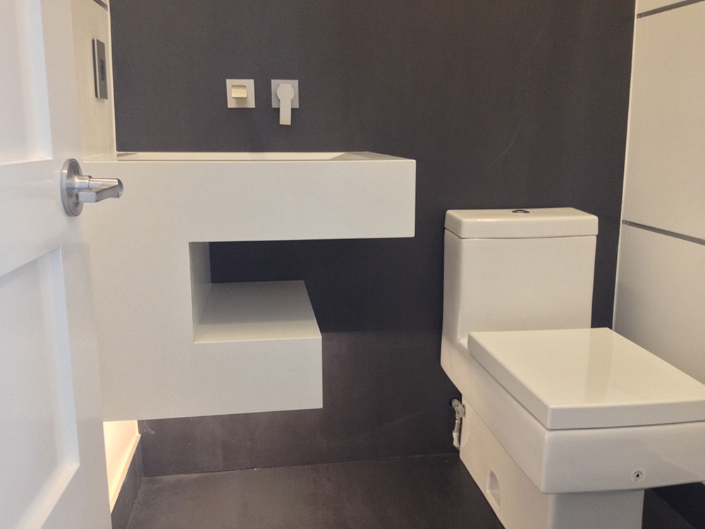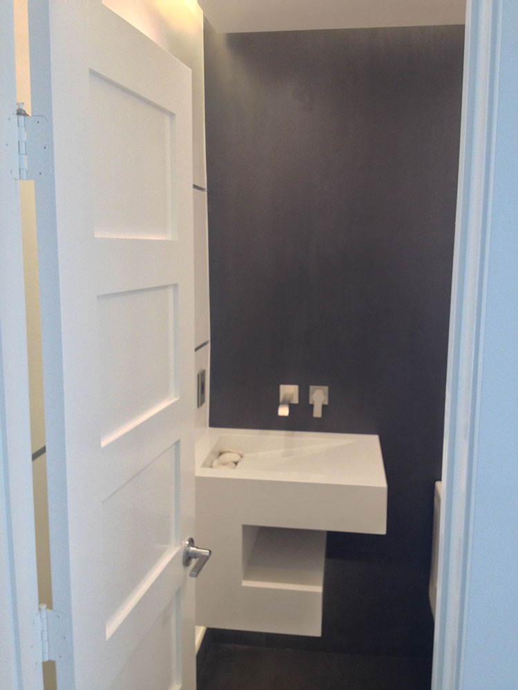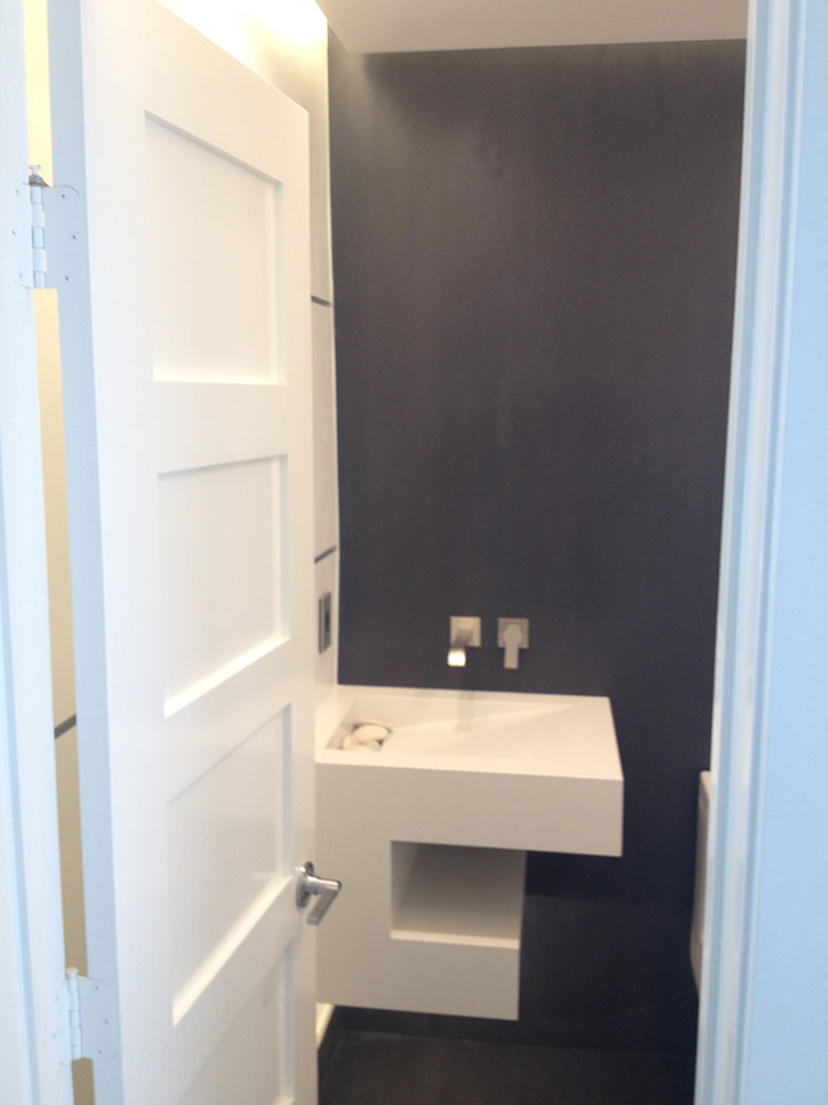 This sleek open Powder Room reflects the contemporary “dream-home” style of small uninterrupted space for a welcoming yet modern look. The wow effect on people face when they walk in and notice all the work that we put in to this small space with focused on design and a unique, open energy. Key features include: