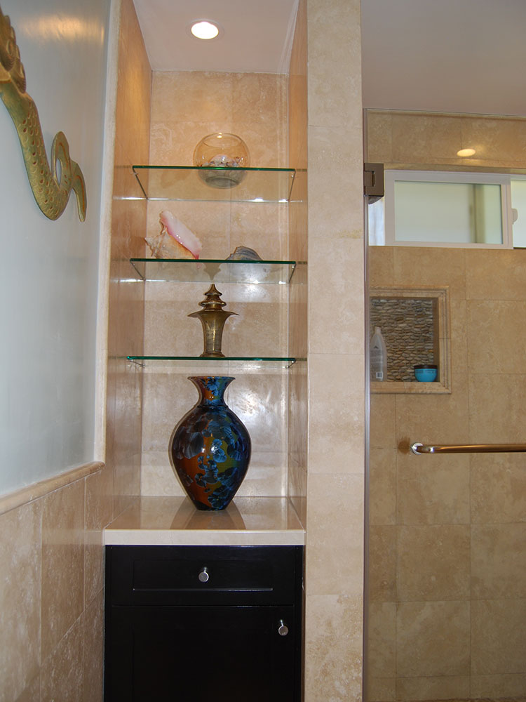 This bathroom boasts not only a magnificent layout but also the latest techniques in eco-friendly design and construction. The Spa feel, and clean finish of espresso stain wood, glass shelves, and natural stone tile come together with towering ceilings to make this open space bathroom an impressive example of eco-friendly modern architecture.